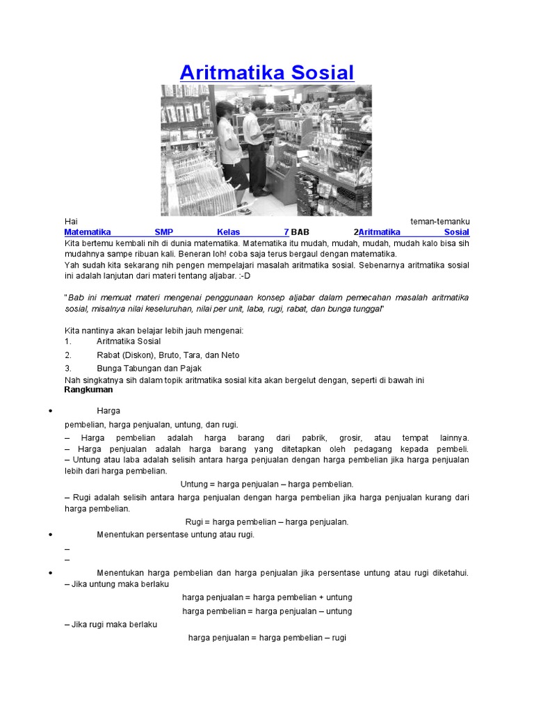 Jadi mulai sekarang jangan takut dengan matematika karena ia sangat bermanfaat. Ajar hitung kini hadi di youtube, silahkan belajar materi ini di link berikut: Simak kumpulan soal un dengan materi aritmatika sosial pada pembahasan di bawah. Contoh soal & pembahasan aritmatika sosial tingkat smp. Soal aritmatika sosial smp kelas 7 pdf. Contoh soal aritmatika sosial dan jawabannya from bakingupforlosttime.blogspot.com. Rp23 000 00 pembahasan soal pertama. Aritmatika sosial berkaitan dengan masalah matematika yang sering kita temui dalam kehidupan sehari hari kita. Mengindikasikan bahwa matematika merupakan ilmu yang sangat penting dikuasai oleh setiap warga negara. Satu hari kemudian kue tersebut terjual habis. Soal uts matematika kelas 7 smp semester 2 aritmatika. Semoga sukses dalam penilaian hariannya ya. Di artikel kali ini kami akan sajikan materi, contoh soal dan pembahasan aritmatika sosial.